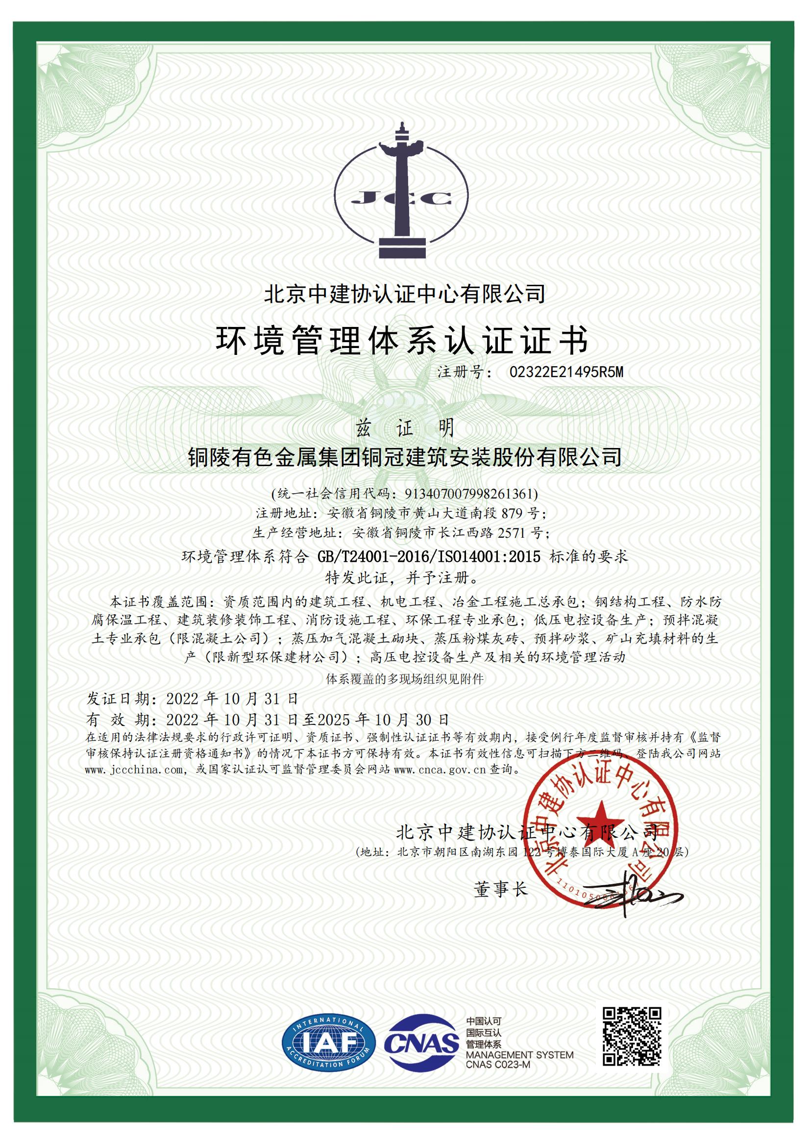 環(huán)境管理體系認(rèn)證證書